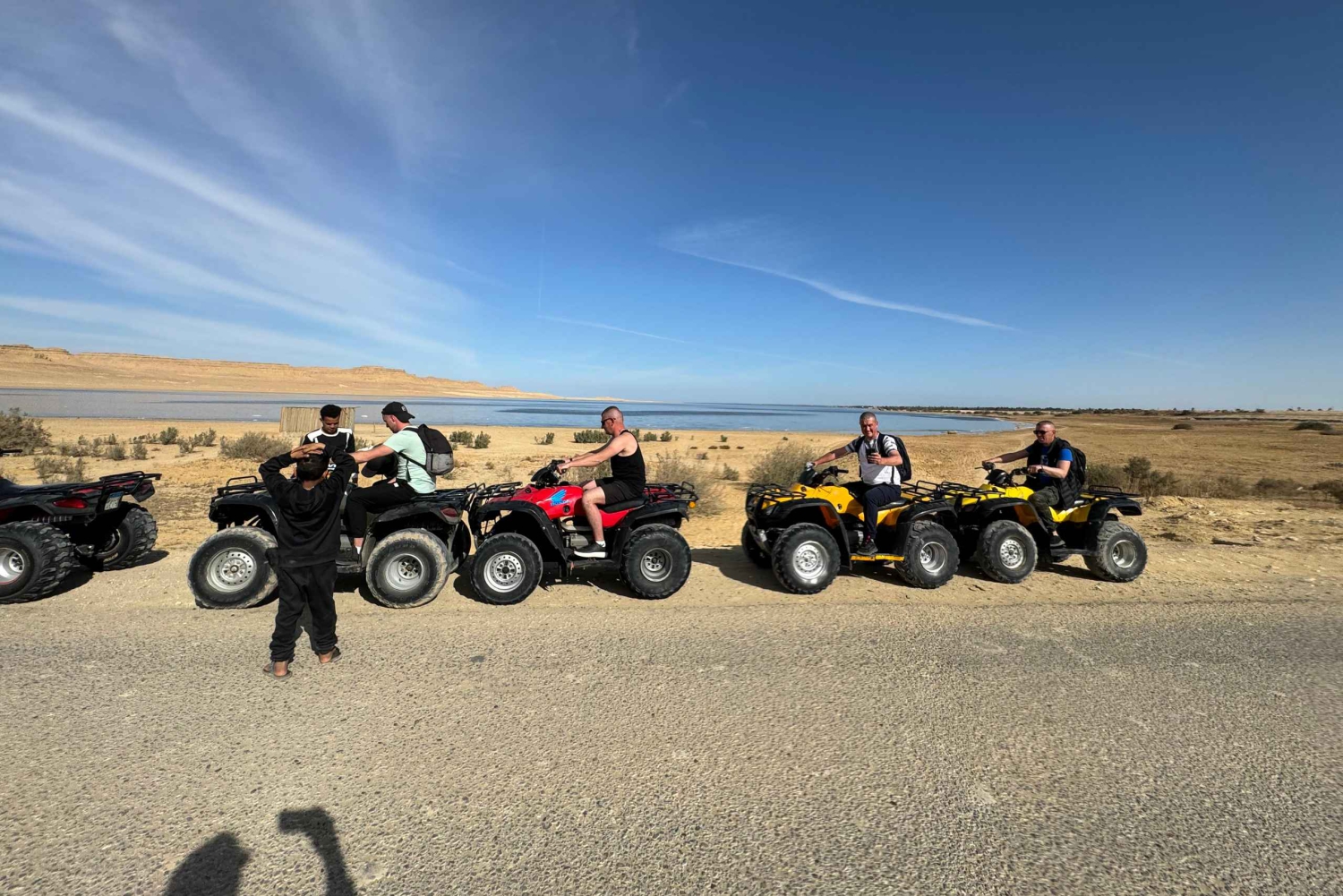 Henting i Kairo kl. 10.00 og avreise til Qaron-sjøen. Ankomst til leiren kl. 12.00. Nyt frokosten og drikk litt te. Nyt Qaron-sjøen og få sjansen til å se flamingoer, utforske området og ta noen bilder. Kl. 14.00 starter vi vår quadbike-tur på 2, 3 eller 4 timer, avhengig av din bestilling. Klatre opp fjellet med firhjulingen og nyt utsikten, kjør fort på Sahara-ørkenen, returner til leiren for lunsj, se solnedgangen over Qaron-sjøen, se på Fayoum-stjernene, gjør deg klar og dra tilbake til Kairo.Includes
